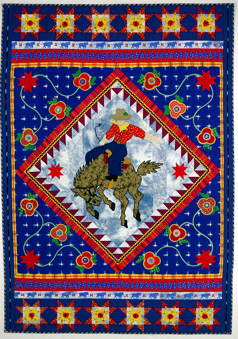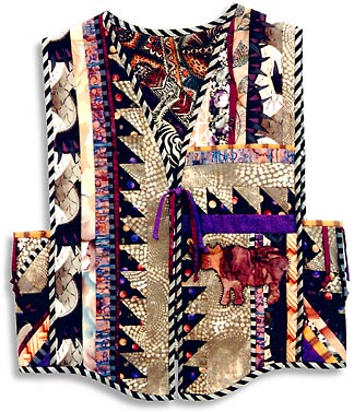 Cathie's work is concise. Her color sense is sure. Her designs are original, but displayed on classic styles. Her pieces are timeless and unique. This coat (Kokopelli's Spirit Horses) is joyful and exuberant! Exhibition Notes from Santa Barbara Historical Museum's exhibit, "Textile Expressions: Contemporary Art Quilts," Feb. 2 – April 16, 2006 |